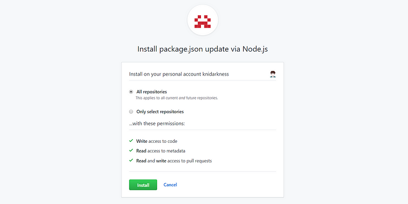 When you click “Install” here, installation of your GitHub App is done. Now it has access to repositories in your account, can read & write them as well as manage pull requests. From now we can actually start developing our implementation for the functionality we mentioned in the beginning of the article.