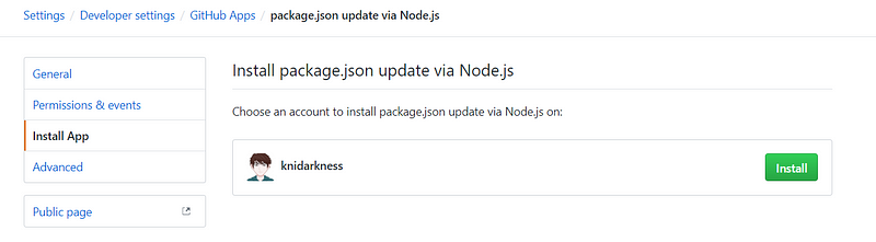The next thing we should do is to give our new GitHub App access to one or several repositories we want it to be able to update. To do that, go to the public page of your app or click “Install App” in the app settings.