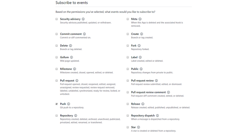 In this part we will touch working with webhooks. First step will be to enable notifications for Push events. To do that go to “Permissions & events” tab in your GitHub App settings and scroll to “Subscribe to events” section. There check “Push” checkbox and then save changes.